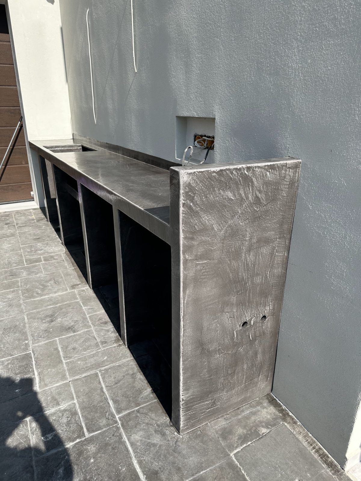 Η πατητή τσιμεντοκονία αποτελεί την ιδανική επιλογή για πάγκους εξωτερικού χώρου, καθώς συνδυάζει τη μοναδική, χειροποίητη αισθητική με την απόλυτη αντοχή στις καιρικές συνθήκες. Το υλικό εφαρμόζεται σε λεπτές στρώσεις πάνω σε σταθερό υπόστρωμα (χτιστό ή τσιμεντοσανίδα), δημιουργώντας μια συνεχή, αδιάβροχη επιφάνεια χωρίς αρμούς που καθαρίζεται πανεύκολα. Η φυσική της εμφάνιση εναρμονίζεται πλήρως με το περιβάλλον ενός κήπου ή μιας βεράντας, προσφέροντας ένα αποτέλεσμα που θυμίζει κυκλαδίτικη αρχιτεκτονική αλλά με σύγχρονες προδιαγραφές αντοχής